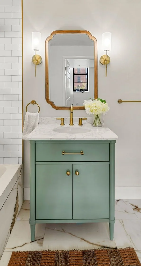 When designing this bathroom, our goal was to create an elegant space reminiscent of a spa. To accomplish this, we started by selecting a beautiful sea green vanity as the focal point of the design. We paired the vanity with a curved wood mirror and brushed gold transitional wall sconces. The gold is carried throughout the rest of the room, including the plumbing fixtures and accessories, as well as the floor tile, which is a large format porcelain tile with gray and gold veining.