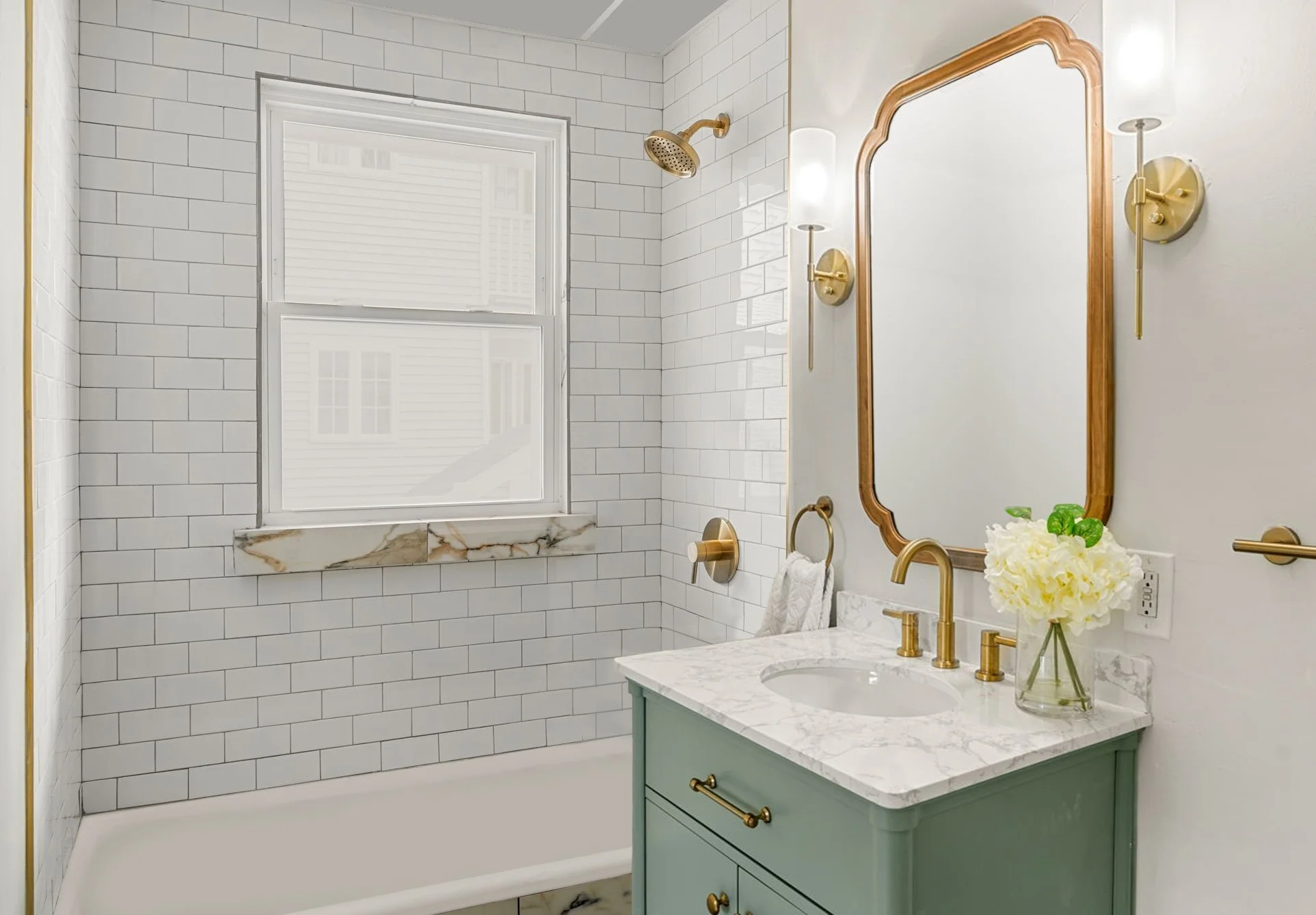 Since the floor tile makes a bold statement, we elected to use a simple white subway tile on the shower walls, but utilized the floor tile to trim out the window, creating a marble-inspired waterproof ledge perfect for storing shampoo bottles and soap. The brushed gold shower trim fixtures bring out the shades of gold present in the porcelain tile and add a touch of glamor. A jute rug with a metallic pattern and a white hydrangea faux flower arrangement add warmth and sophistication to the room.