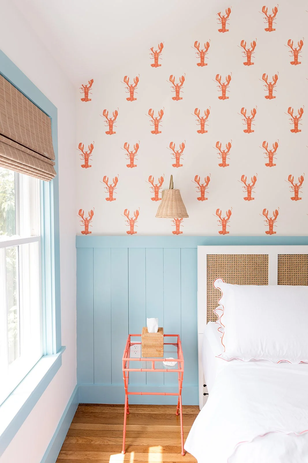 Our goal with the design of the bedrooms was to give each room a different look to create a memorable experience for guests, yet ensure that the two rooms felt cohesive. In order to accomplish this, we installed vertical shiplap paneling along the main wall of each room, then used the same shade of blue paint on the paneling, trim, and doors in both rooms. Next, we added fun wallpaper above the paneling, opting for lobsters in one bedroom and sailboats in the other.