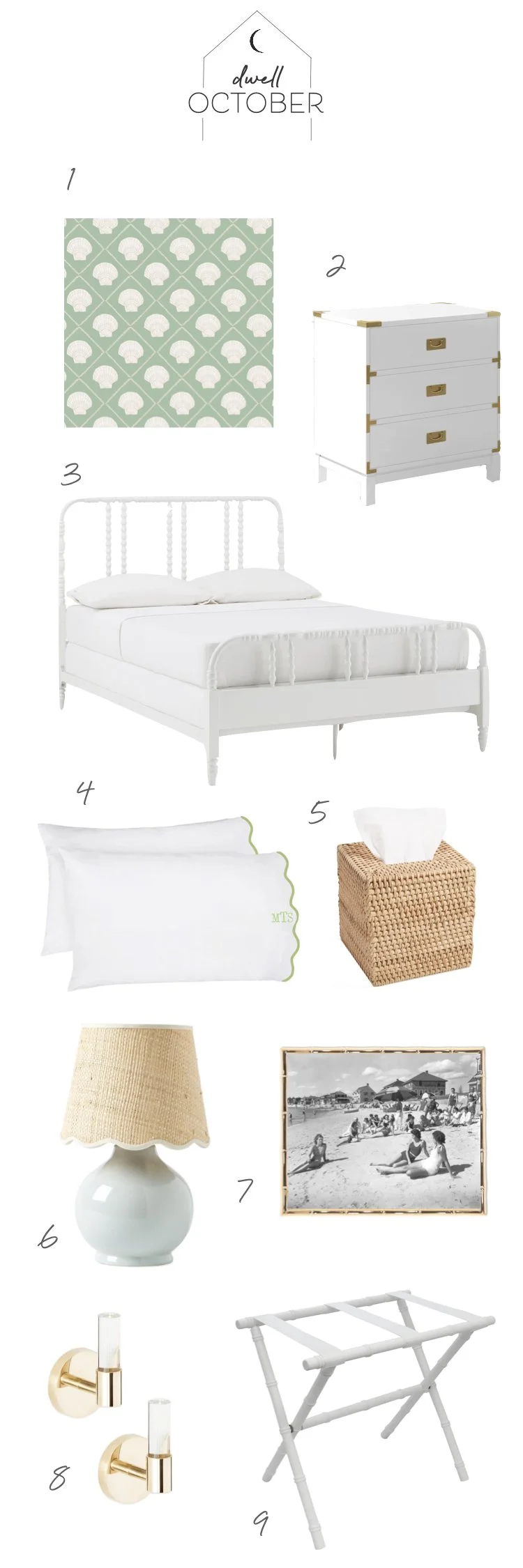 1 Wallpaper / 2 Nightstand (similar style found here) / 3 Bed / 4 Sheet Set / 5 Tissue Box Cover / 6 Lamp (similar style available here) / 7 Art Print & Frame / 8 Hooks / 9 Luggage Rack